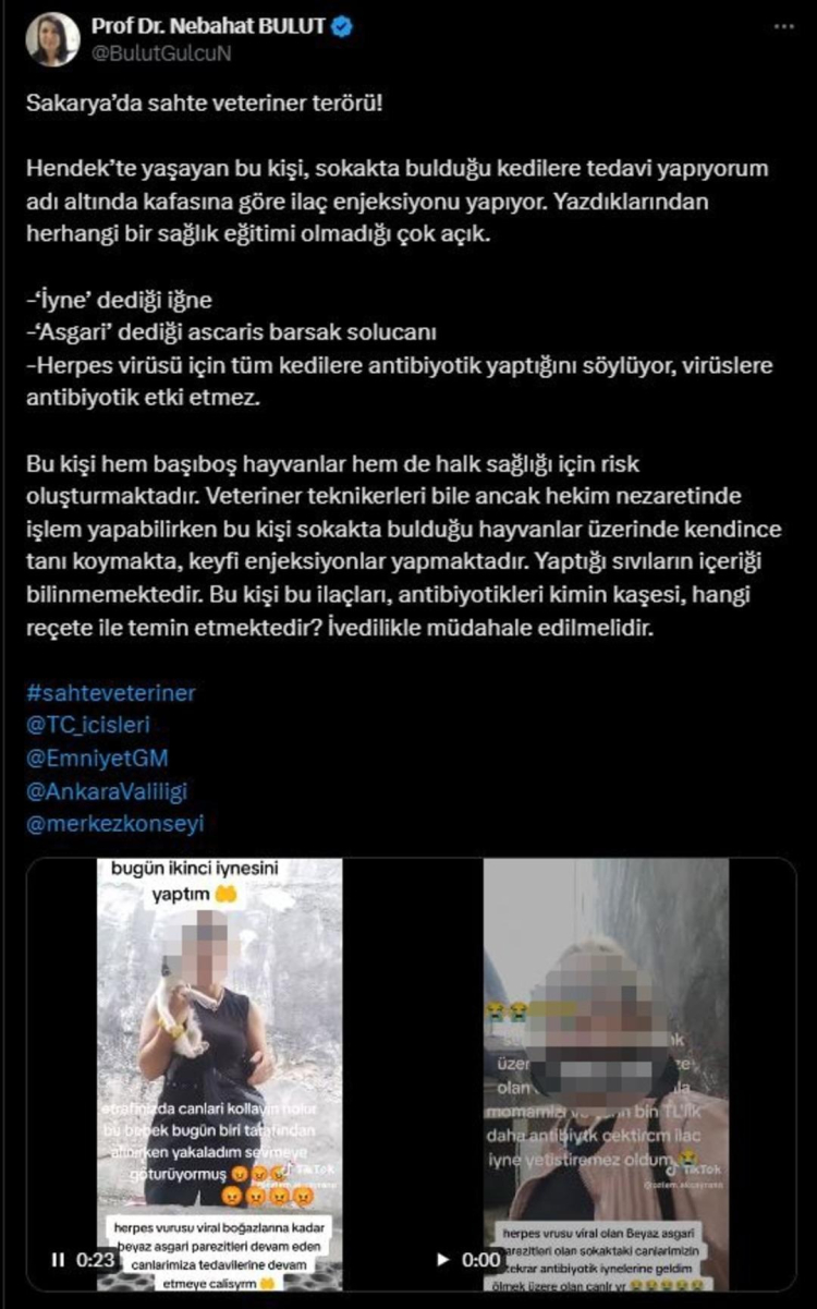 “Bu kişi veteriner hekim değildir. Veteriner hekim olmayan hiç kimse hayvanlara tedavi veya koruyucu hekimlik uygulamaları gerçekleştiremez. Hayvanseverlik adı altında hem hayvan hem de insan sağlığı riske atılamaz.”