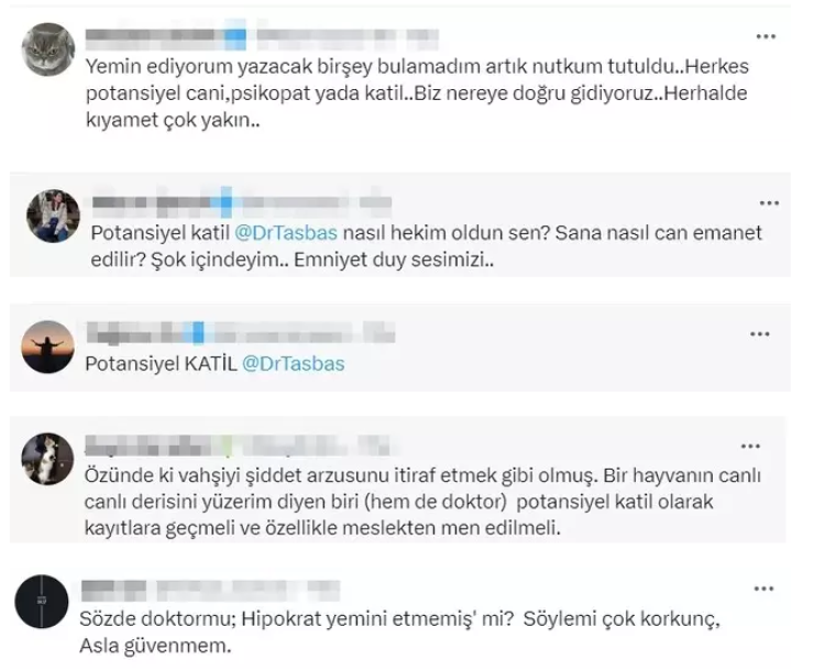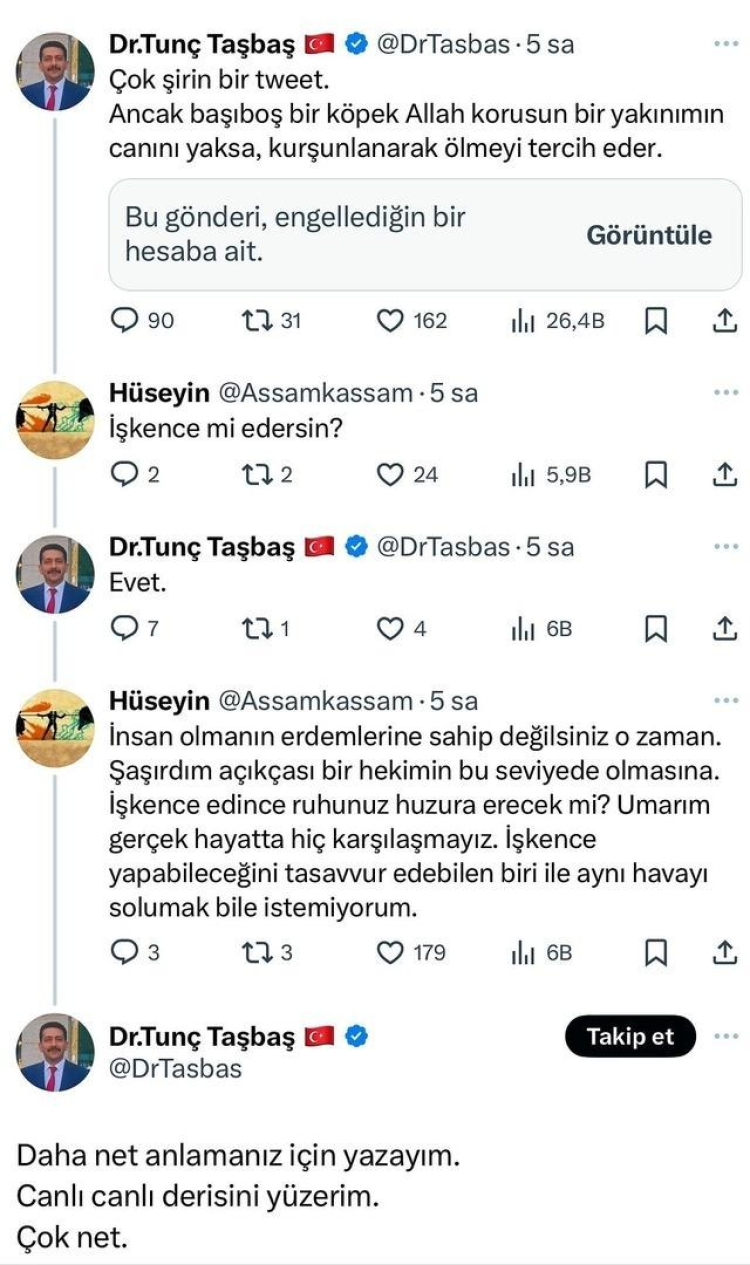 Doktor Tunç Taşbaş, başıboş köpeklerle ilgili bir tartışmaya dahil olarak 'Allah korusun bir yakınımın canını yaksa kurşunlanarak ölmeyi tercih eder' dedi. İşkence konusuna da giren Doktor Taşbaş, 'Daha net anlamanız için yazayım canlı canlı derisini yüzerim çok net' ifadelerini kullandı.