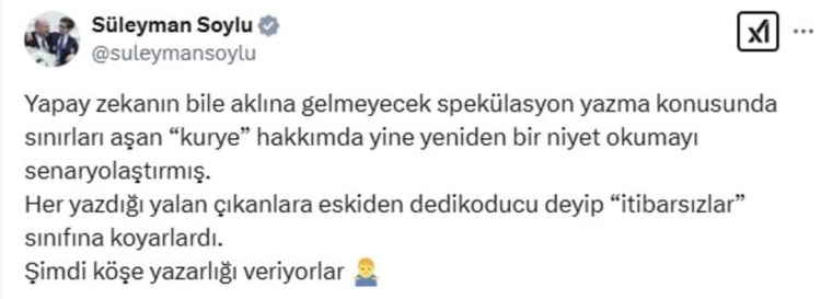 Soylu sosyal medya hesabından, "Yapay zekanın bile aklına gelmeyecek spekülasyon yazma konusunda sınırları aşan “kurye” hakkımda yine yeniden bir niyet okumayı senaryolaştırmış. Her yazdığı yalan çıkanlara eskiden dedikoducu deyip “itibarsızlar” sınıfına koyarlardı. Şimdi köşe yazarlığı veriyorlar." paylaşımını yaptı.