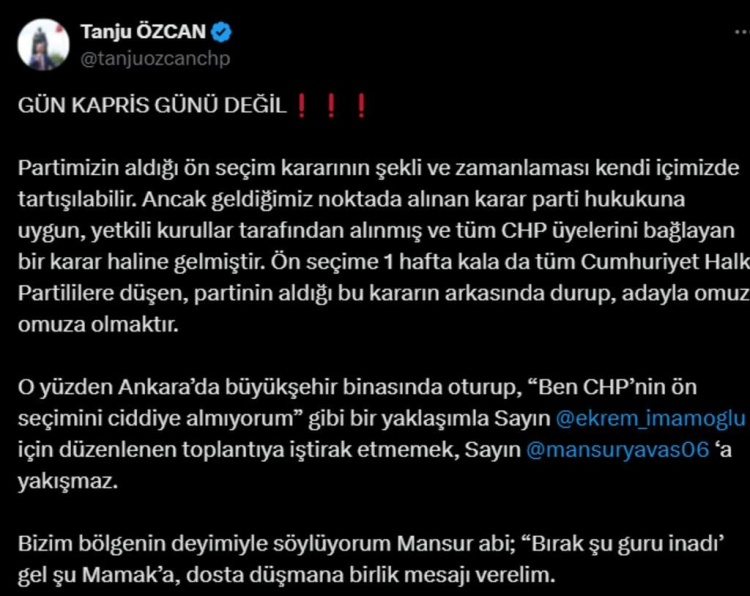 "Partimizin aldığı ön seçim kararının şekli ve zamanlaması kendi içimizde tartışılabilir. Ancak geldiğimiz noktada alınan karar parti hukukuna uygun, yetkili kurullar tarafından alınmış ve tüm CHP üyelerini bağlayan bir karar haline gelmiştir. Ön seçime 1 hafta kala da tüm Cumhuriyet Halk Partililere düşen, partinin aldığı bu kararın arkasında durup, adayla omuz omuza olmaktır.