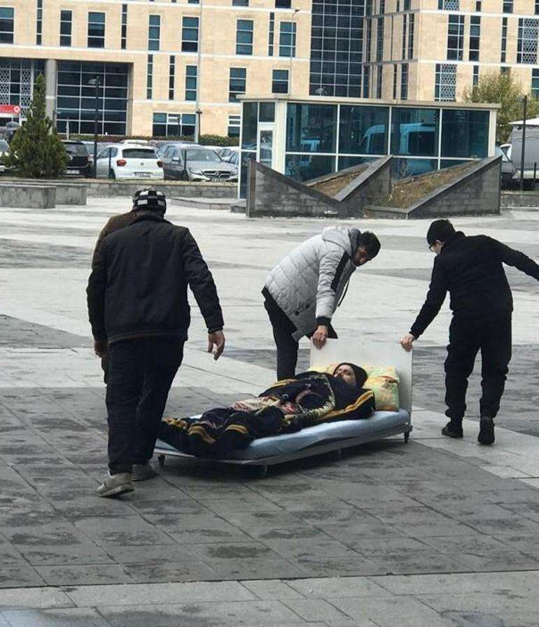 Kayseri'de Suriye uyruklu bedensel engelli Yusuf K. (50), boşanma davasının görüldüğü Kayseri Adliyesi'ne, tekerlekli yatak ile getirildi.