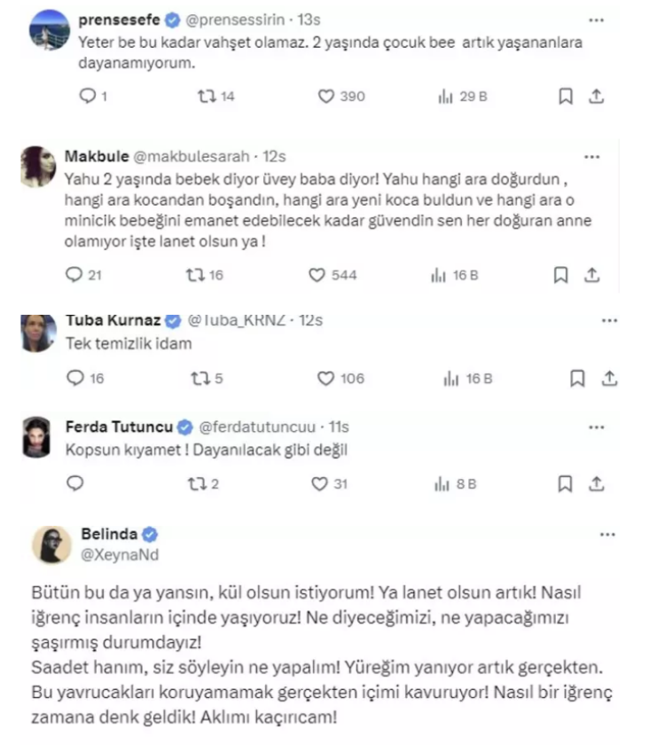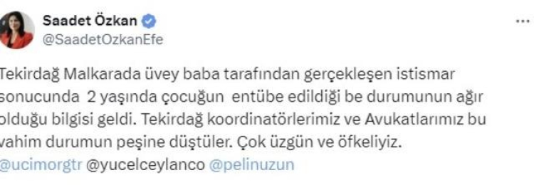 Özkan ses getiren paylaşımında, "Tekirdağ Malkara'da üvey baba tarafından gerçekleşen istismar sonucunda 2 yaşında çocuğun entübe edildiği be durumunun ağır olduğu bilgisi geldi. Tekirdağ koordinatörlerimiz ve Avukatlarımız bu vahim durumun peşine düştüler. Çok üzgün ve öfkeliyiz." ifadelerine yer verdi.