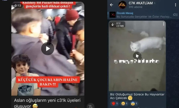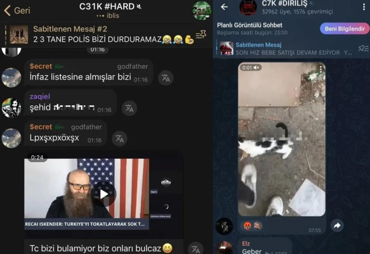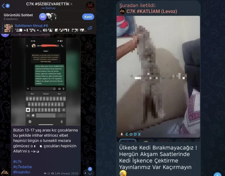Bazı uygulamalarda gruplaşan gençler suç işlemekten çekinmiyor hatta bunun için birbirlerini teşvik bile ediyorlar. Telegram'da bulunan C7K ve C31K adlı suç grupları bu örneklerden sadece ikisi. Gruplardan milli ve dini değerlere hakaret yağdıran şahıslar, kedilere işkence edip videoları paylaşıyorlar. Şehit yakınlarını hedefe koyan ve hakaret eden şahıslar, bazı aileleri de kızlarını öldürmekle tehdit ediyor. Şahıslar bazı ifadelerinde ise adeta devlete meydan okuyorlar. İşte detaylar...