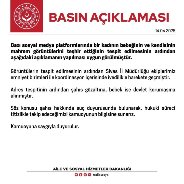 "Bazı sosyal medya platformlarında bir kadının bebeğinin ve kendisinin mahrem görüntülerini teşhir ettiğinin tespit edilmesinin ardından aşağıdaki açıklamanın yapılması uygun görülmüştür.