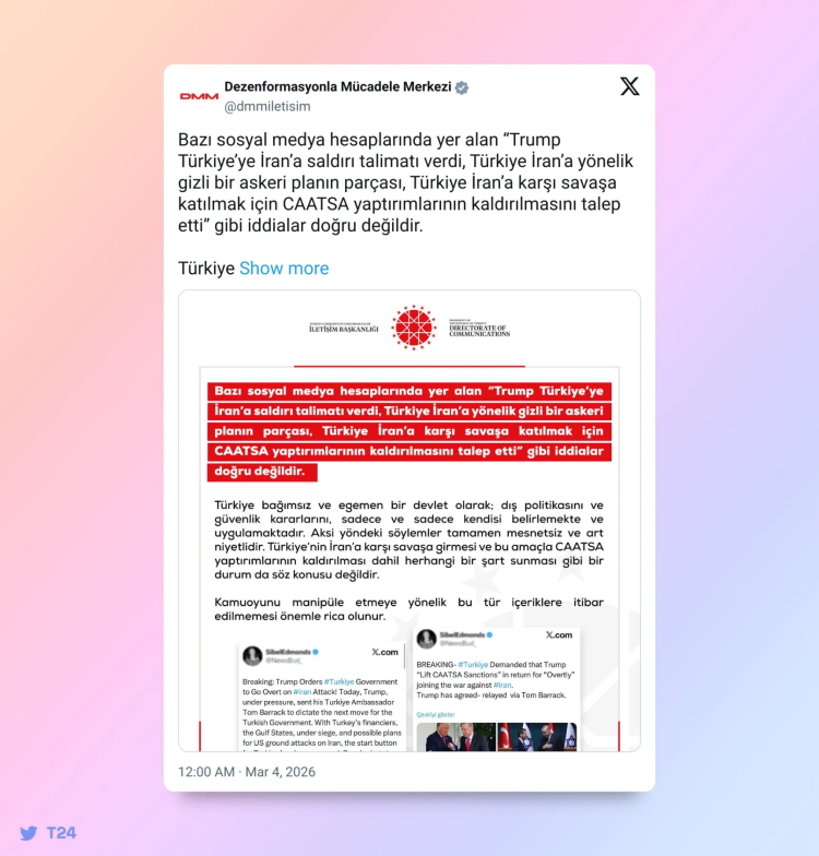 Dezenformasyonla Mücadele Merkezi (DMM), bazı sosyal medya hesaplarında paylaşılan "Trump Türkiye'ye İran'a saldırı talimatı verdi, Türkiye İran'a yönelik gizli bir askeri planın parçası, Türkiye İran'a karşı savaşa katılmak için CAATSA yaptırımlarının kaldırılmasını talep etti" iddialarını yalanladı.