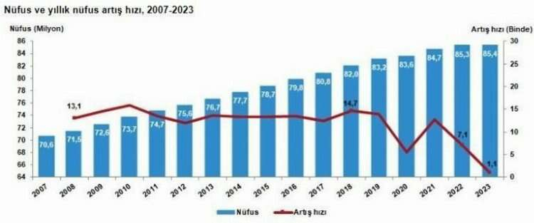 Yıllık nüfus artış hızı 2022 yılında binde 7,1 iken, 2023 yılında binde 1,1 oldu.