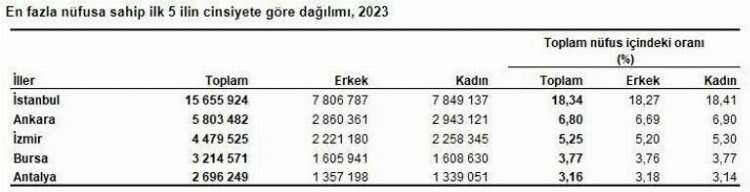 İstanbul'un nüfusu, bir önceki yıla göre 252 bin 27 kişi azalarak 15 milyon 655 bin 924 kişi oldu. Türkiye nüfusunun yüzde 18,34'ünün ikamet ettiği İstanbul'u, 5 milyon 803 bin 482 kişi ile Ankara, 4 milyon 479 bin 525 kişi ile İzmir, 3 milyon 214 bin 571 kişi ile Bursa ve 2 milyon 696 bin 249 kişi ile Antalya izledi.