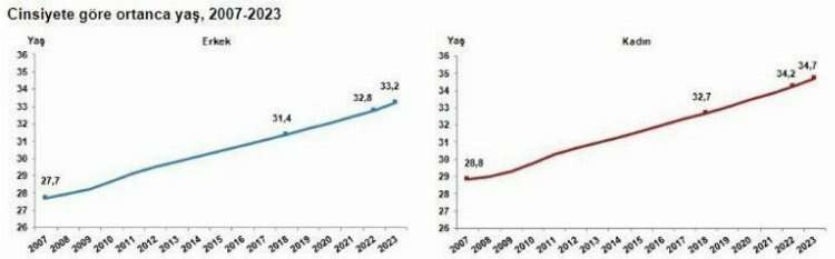 Türkiye'de 2022 yılında 33,5 olan ortanca yaş, 2023 yılında 34'e yükseldi. Cinsiyete göre incelendiğinde, ortanca yaşın erkeklerde 32,8'den 33,2'ye, kadınlarda ise 34,2'den 34,7'ye yükseldiği görüldü.