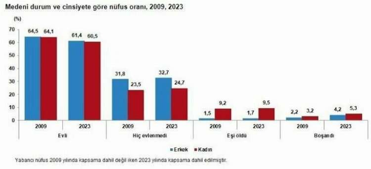 Ülkemizde 2009 ve 2023 yılı cinsiyete göre medeni durumun dağılımı incelendiğinde, erkeklerde hiç evlenmeyenlerin oranının kadınlara göre daha yüksek olduğu, kadınlarda ise eşi ölenlerin ve boşananların oranının erkeklerden daha fazla olduğu görüldü. Diğer yandan büyük çoğunluğu oluşturan evlilerin oranının 2009 ve 2023 yılında her iki cinsiyette de birbirine yakın oranlarda olduğu görüldü.