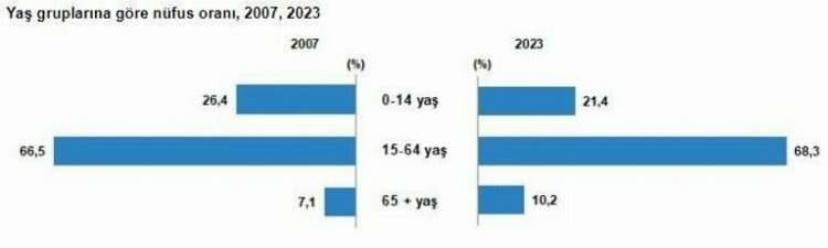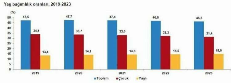 Çalışma çağındaki birey başına düşen çocuk sayısını ifade eden çocuk bağımlılık oranı, %32,3'ten, %31,4'e gerilerken, çalışma çağındaki birey başına düşen yaşlı birey sayısını ölçen yaşlı bağımlılık oranı ise ,5'ten 'e yükseldi. Diğer bir ifadeyle, Türkiye'de 2023 yılında, çalışma çağındaki her 100 kişi, 31,4 çocuğa ve 15 yaşlıya bakmaktadır.