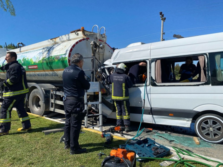 Aydoğan Şen yönetimindeki tur minibüsü, Dikmen Mahallesi Turizm Caddesi'nde Antalya Büyükşehir Belediyesi'ne ait olan ve refüjdeki ağaçları sulayan Ramazan Doğan idaresindeki sulama tankerine arkadan çarptı.