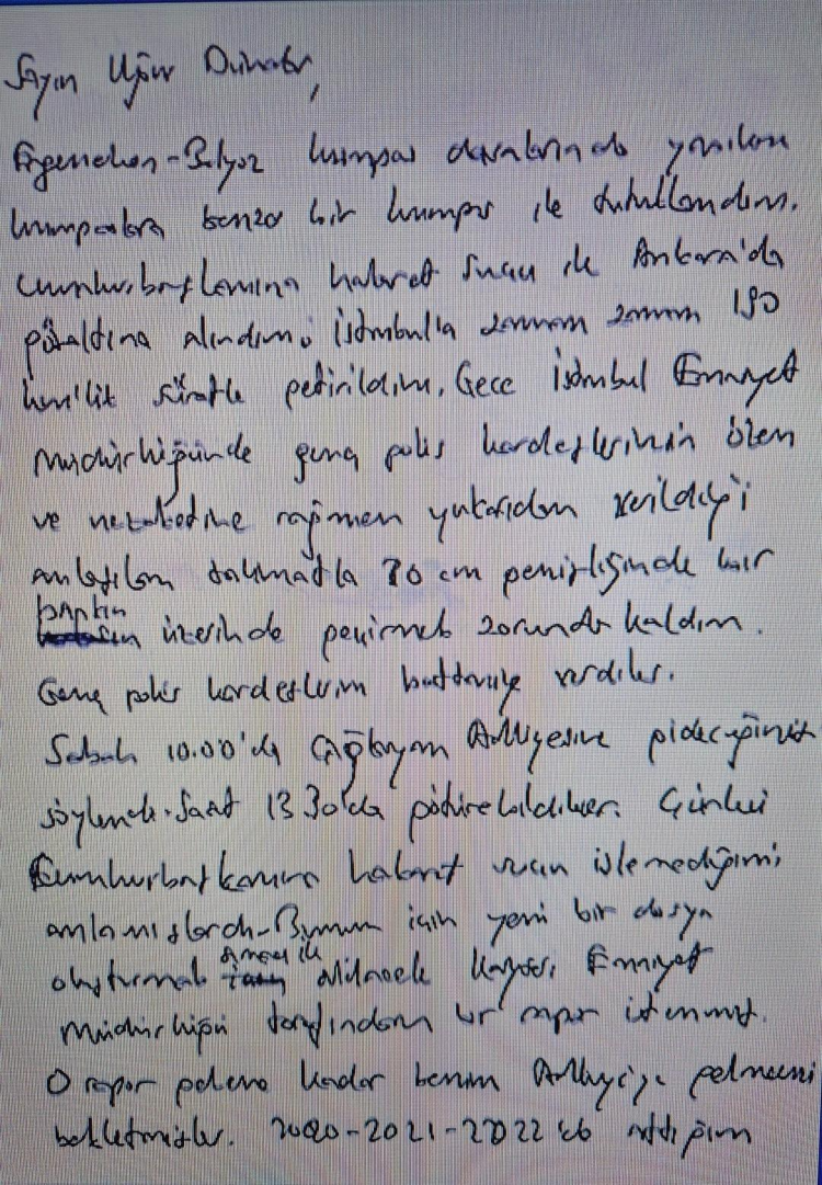 "Sayın Uğur Dündar, Ergenekon ve Balyoz kumpas davalarında yapılan kumpaslara benzer bir kumpas ile tutuklandım. Cumhurbaşkanına hakaret suçu gerekçesiyle Ankara’da gözaltına alındım. İstanbul’a zaman zaman 190 km hızla getirildim. Geceyi, İstanbul Emniyet Müdürlüğü’nde, genç polis kardeşlerimin özen ve nezaketine rağmen, yukarıdan verildiği anlaşılan bir talimatla, 30 santimetre genişliğindeki bir bank üzerinde geçirmek zorunda kaldım. Genç polis kardeşlerim bana battaniye verdiler. Sabah 10’da Çağlayan Adliyesi’ne gideceğimiz söylendi. Ancak ancak saat 13.30’da götürüldüm. Çünkü Cumhurbaşkanına hakaret suçunu işlemediğimi anlamışlardı."