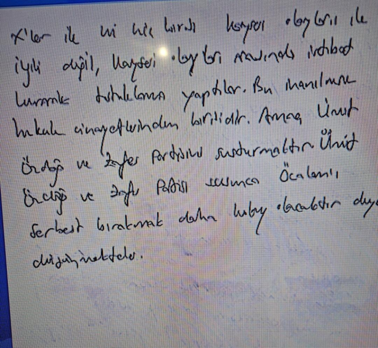 "Bunun için yeni bir dosya oluşturmak amacıyla Kayseri Emniyet Müdürlüğü’nden bir rapor istenmiş. O rapor gelene kadar adliyeye sevk edilmem bekletildi. 2020, 2021 ve 2022’de attığım tweetler üzerinden, hiçbirisi Kayseri olaylarıyla ilgili olmamasına rağmen, bu tweetler ile Kayseri olayları arasında bağlantı kurularak tutuklama yapıldı. Bu, inanılmaz bir hukuk cinayetidir. Amaç, Ümit Özdağ ve Zafer Partisi’ni susturmaktır. Ümit Özdağ ve Zafer Partisi sustuğunda, Öcalan’ı serbest bırakmak daha kolay olacaktır diye düşünmekteler."
