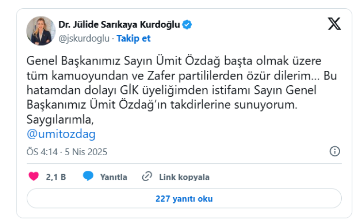 "Genel Başkanımız Sayın Ümit Özdağ başta olmak üzere tüm kamuoyundan ve Zafer partililerden özür dilerim… Bu hatamdan dolayı GİK üyeliğimden istifamı Sayın Genel Başkanımız Ümit Özdağ’ın takdirlerine sunuyorum. Saygılarımla..."