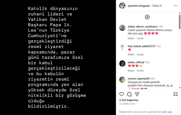 İstanbul Kadıköy'de 24 Ocak'ta alışveriş yapmak için gittiği bitpazarında uğradığı bıçaklı saldırı sonucuyaşamını yitiren Mattia Ahmet Minguzzi'nin annesi Yasemin Minguzzi, sosyal medya hesabından yaptığı açıklamada Vatikan Devlet Başkanı Papa 14. Leo ile görüşeceklerini duyurdu.