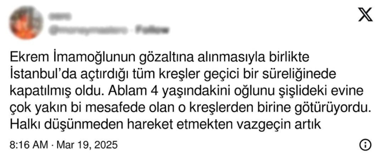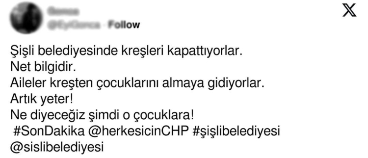 Türkiye ve dünya kamuoyunda gündem olan gözaltı kararlarının ardından dikkat çeken bir iddia gündeme geldi. Şişli Belediyesi tarafından açılan kreşlerin kapatıldığı öne sürüldü.