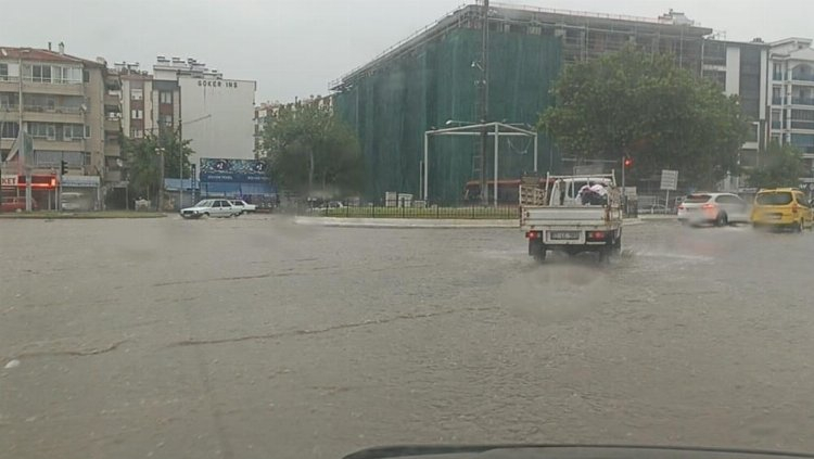 Balıkesir’in Edremit ilçesinde aniden bastıran yağmur, caddeleri göle çevirdi. Bazı iş yerleri sular altında kaldı.