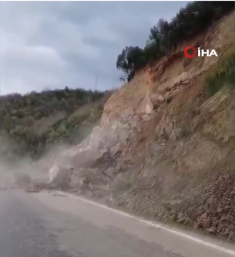 Yalova'da toprak kayması nedeniyle yola dev kayalar düştü. Trafiğe kapanan Armutlu yolu temizlik çalışmasının ardından açılırken yaşanan toprak kayması kameraya yansıdı.