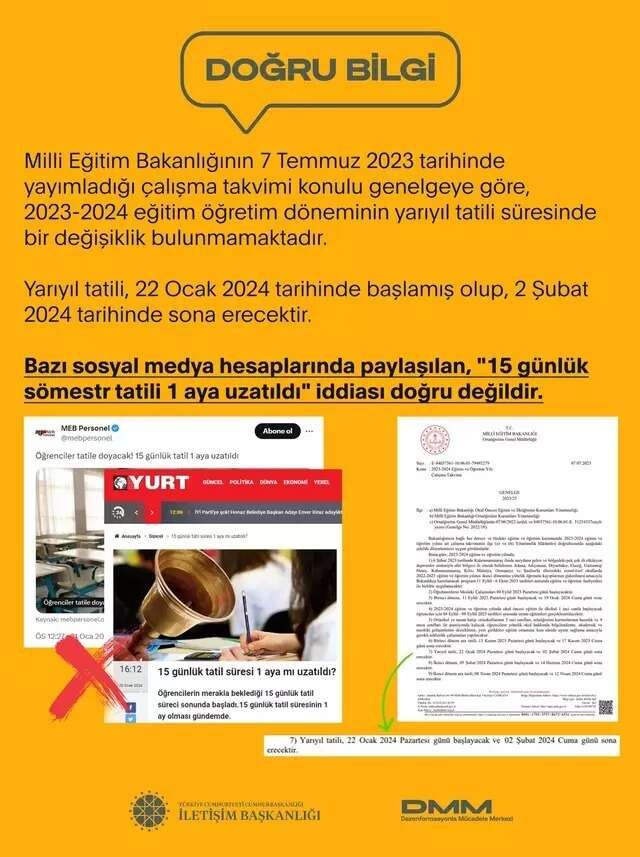 Dezenformasyonla Mücadele Merkezinden gelen açıklamayla söz konusu iddia yalanlandı. Açıklamada tatilin uzatıldığı iddiasının doğru olmadığı belirtilirken "Milli Eğitim Bakanlığı’nın 7 Temmuz 2023 tarihinde yayımladığı çalışma takvimi konulu genelgeye göre, 2023-2024 eğitim öğretim döneminin yarıyıl tatili süresinde bir değişiklik bulunmamaktadır" ifadelerine yer verildi.