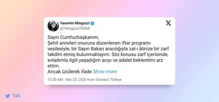 Mattia Ahmet Minguzzi'nin annesi Yasemin Minguzzi, Cumhurbaşkanı Recep Tayyip Erdoğan'a hitaben yaptığı paylaşımda, şehit anneleri onuruna düzenlenen iftar programında bir bakan aracılığıyla kendisine mektup yazdığını belirtti. Minguzzi, mektubun Erdoğan'a ulaşıp ulaşmadığını sordu, oğlunun ölümüne ilişkin dosyada iki kişinin hâlâ serbest olduğunu söyledi.