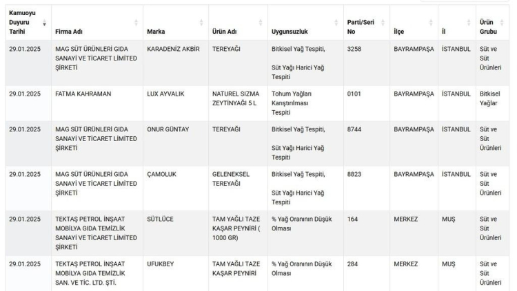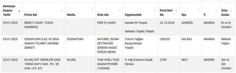Bakanlığın 29 Ocak 2024 tarihli olarak yayınladığı yeni listede çok sayıda ürün çeşidi ve marka yer aldı. Listede çok sayıda üründe yapılan uygunsuzluk tek tek tespit edilerek paylaşıldı. Buna göre; zeytinyağına tohum yağları karıştırıldığı, pide iç harcında kanatlı eti ve sakatat tespit edildiği görüldü.
