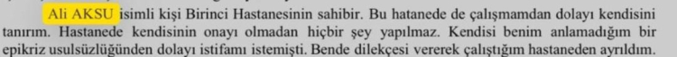 Yine bir başka iddiaya göre ise söz konusu hastanedeki epkriz raporunda usulsüzlük tespit eden bir doktor, apar topar Ali Aksu'nun talimatıyla hastaneden istifası isteniyor. Doktor da dilekçesini vererek hastaneden ayrılıyor.