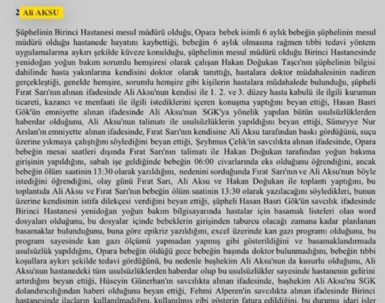 Hatta Opara bebeğin ölümüyle ilgili Aksu detayı da dikkat çekti. Şeyhmus Çelik'in savcılıkta alınan ifadesinde Opara bebeğin mesai saatleri dışında Fırat Sarı'nın talimatı ile yoğun bakıma girişinin yapıldığını, sabah işe geldiğinde bebeğin 06.00 civarında eks olduğunu öğrendiğini, ancak bebeğin ölüm saatinin 13.30 olarak yazıldığını, nedenini sorduğunda Fırat Sarı'nın ve Ali AKsu'nun böyle istediğini anlattığı yer aldı.