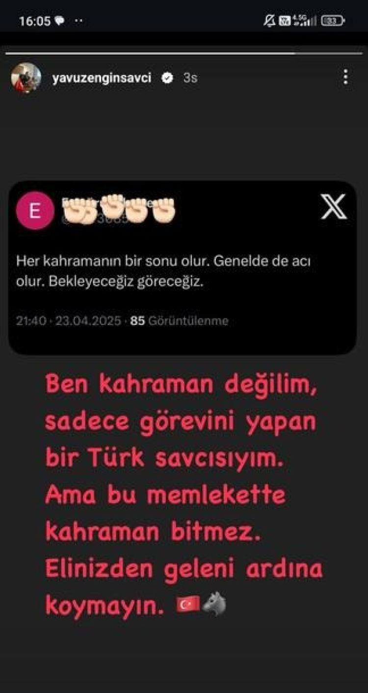"Her kahramanın bir sonu olur. Genelde de acı olur. Bekleyeceğiz, göreceğiz" şeklindeki tehditvari paylaşımı alıntılayan Engin, "Ben kahraman değilim, sadece görevini yapan bir Türk savcısıyım. Ama bu memlekette kahraman bitmez. Elinizden geleni ardınıza koymayın" ifadelerine yer verdi.
