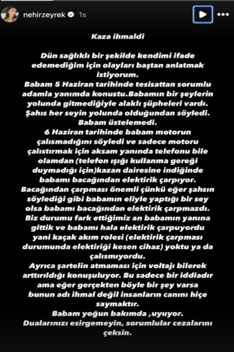 Evinde elektrik akımına kapılan ve hastanede yoğun bakıma alınan Manisa Büyükşehir Belediye Başkanı Ferdi Zeyrek’in kızı Nehir Zeyrek sosyal medya hesabından "ihmal" iddiasında bulundu.