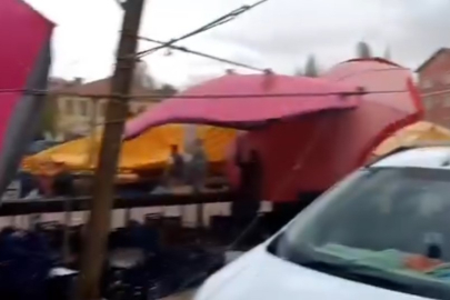 Yozgat'ın Sarıkaya ilçesinde etkili olan fırtına, ilçede kurulan semt pazarında etkili oldu. Alışveriş yapmak için pazara giden vatandaşlar fırtınanın etkisini göstermesiyle zor anlar yaşadı. Pazardaki şemsiyelerin uçtuğu anlar cep telefonu kamerasıyla görüntülendi.