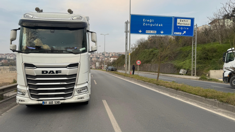 Zonguldak'ta tırın kör noktasına giren otomobil refüje çıktı