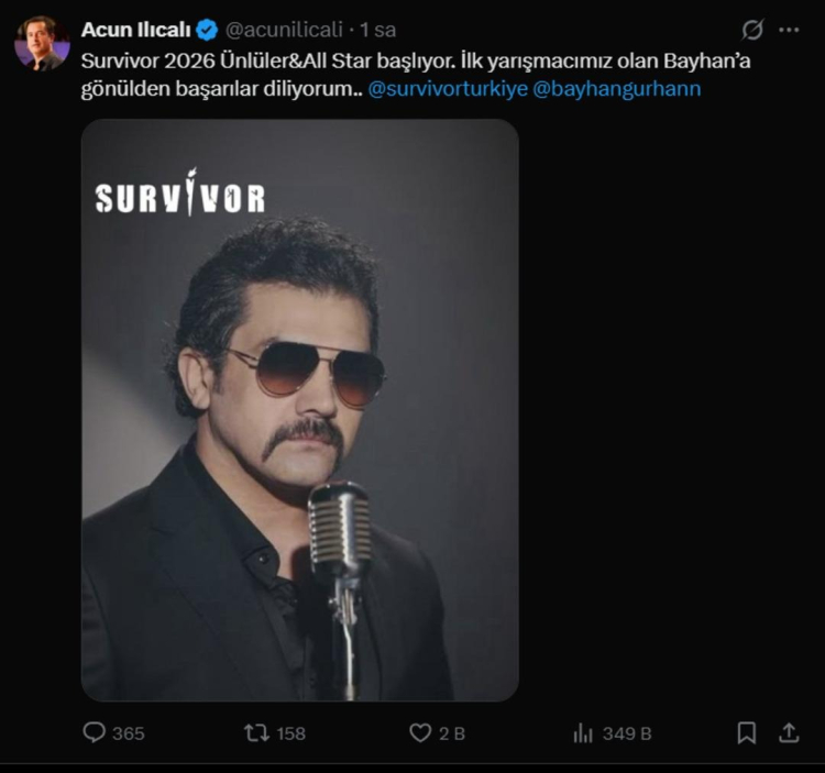 Acun Ilıcalı "Survivor 2026 Ünlüler&All Star başlıyor. İlk yarışmacımız olan Bayhan’a gönülden başarılar diliyorum" diyerek ilk yarışmacıyı sosyal medyadan yayınladı.