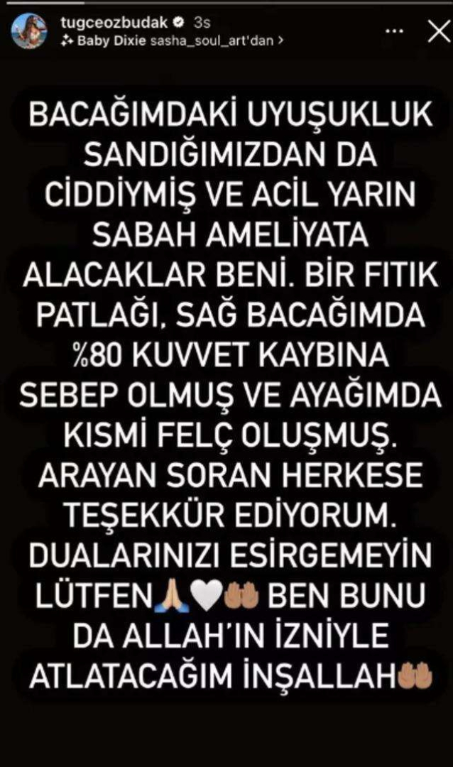 Son olarak ameliyattan çıktığını ve operasyonun iyi geçtiğini duyuran Özbudak, "Ameliyatım güzel geçmiş çok şükür. Güçlü ol Tuçi" mesajıyla hastane yatağından fotoğraf paylaştı.