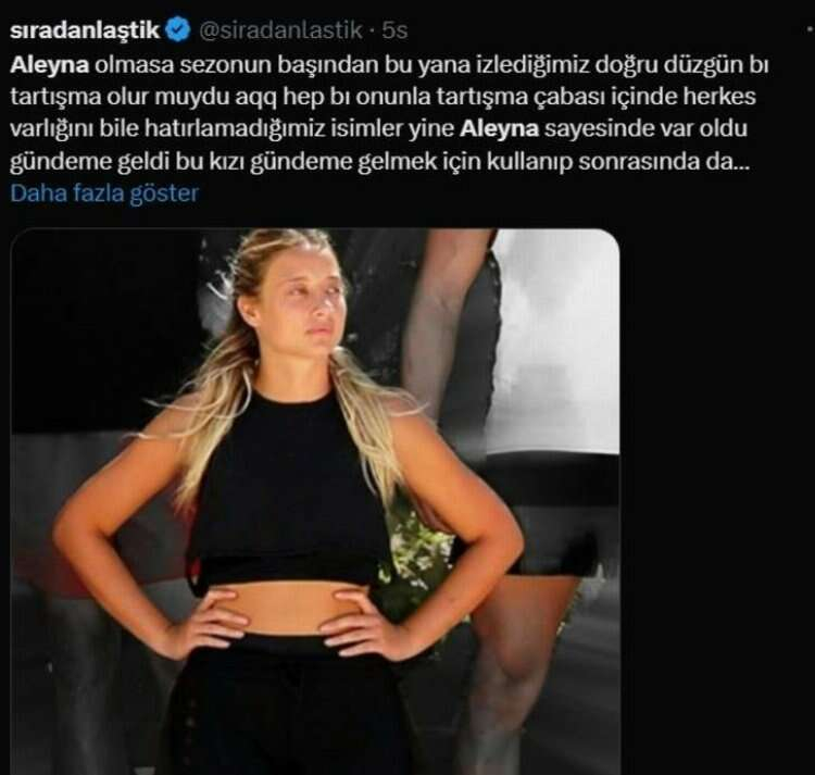 Son olarak Yunus Emre'nin eşinin yaptığı "Aleyna'dan uzak dur" uyarısıyla gündeme gelen Aleyna Survivor fragmandaki haliyle dikkat çekti. Aleyna Kalaycıoğlu'nun sinir krizi geçirdiği anlar herkesi üzdü.