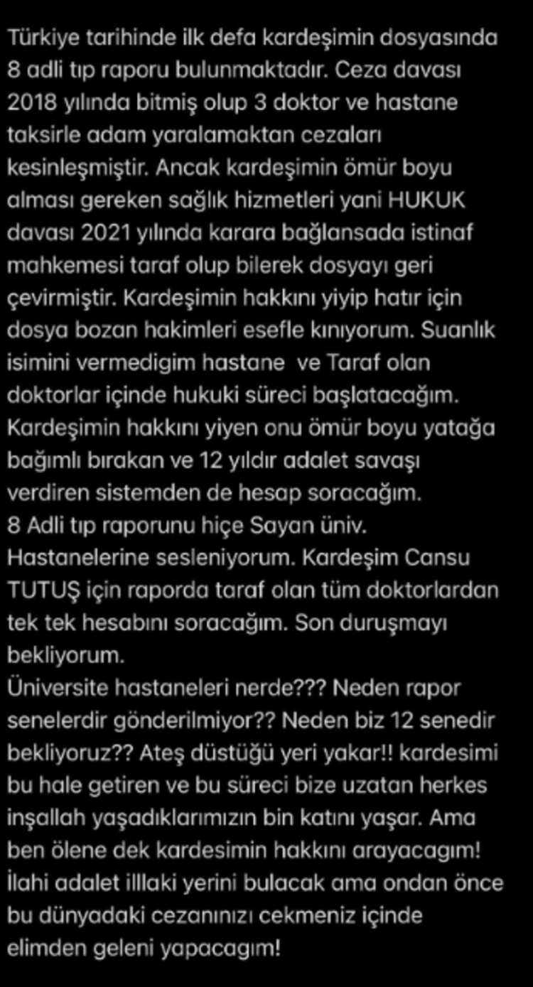 "Cansu yoğun bakıma alınınca sözde doktor tatilden döndü." diyen ünlü isim "Ama artık her şey için çok geçti. Kardeşimin kalbi 70 dakika boyunca dumuştu. Beyninin %70'inden fazlası hasarlıydı. Fişini çekmek için anneme sordular. Birkaç ay ömür biçmişlerdi. Ama annem 'Ben Cansu’yu hayatta tutacağım' dedi. Kardeşim sadece tip 1 diyabet hastasıymış! Ameliyatlık bir durumu da yoktu, hiçbir şeyi yoktu kardeşimin!" sözleriyle yaşadıkları ihmale isyan etti.