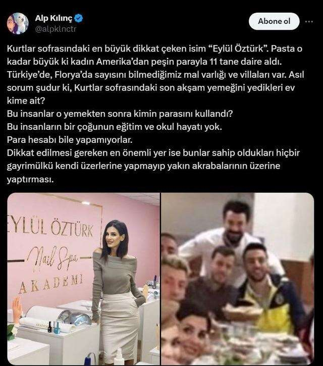 Sosyal medya fenomenlerine dair iddialar bitmiyor. Alp Kılınç son olarak "Kurtlar sofrasındaki en büyük dikkat çeken isim Eylül Öztürk" diyerek şoke eden ifadeler kullandı.
