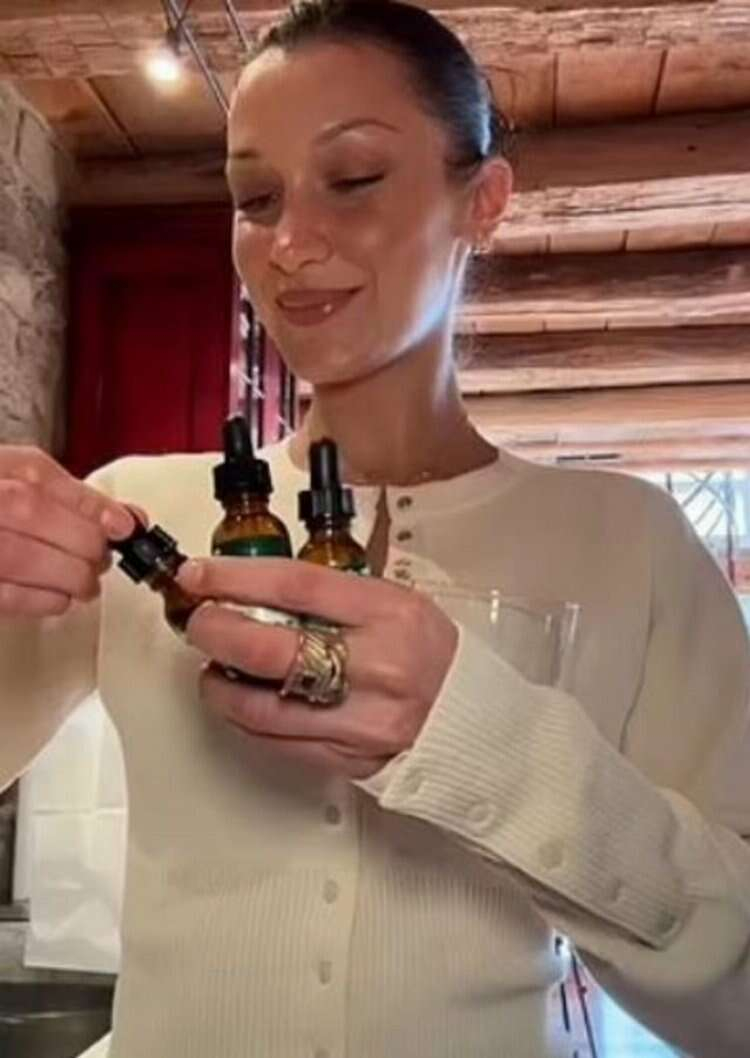 Bella videoda tek seferde 14 vitamin yuttu ve buna sağlıklı bir yeşil meyve suyu eşlik etti. Model deniz yosunu jeli içti, temel yağlar aldı ve vücuttaki toksinleri temizlemeyi amaçlayan Fulvic Detoks'u yudumladı.