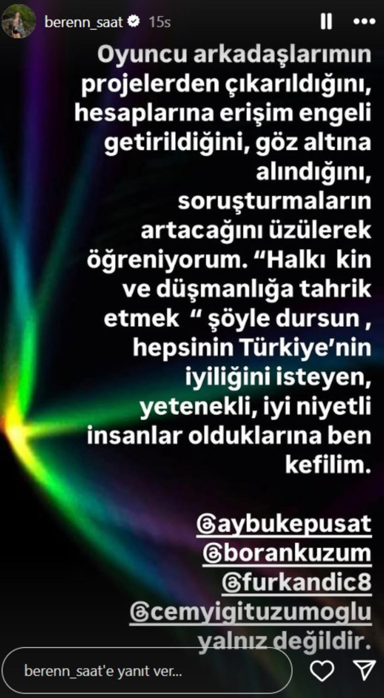 Sosyal medya hesabından paylaşım yapan Beren Saat, meslektaşlarına destek vermekten çekinmedi. Saat; "Oyuncu arkadaşlarımın projelerden çıkarıldığını, hesaplarına erişin engeli getirildiğini, gözaltına alındığını, soruşturmaların artacağını üzülerek öğreniyorum. 'Halkı kin ve düşmanlığa tahrik etmek' şöyle dursun, hepsi Türkiye'nin iyiliğini isteyen, yetenekli, iyi niyetli insanlar olduklarına ben kefilim." ifadelerini kullandı.