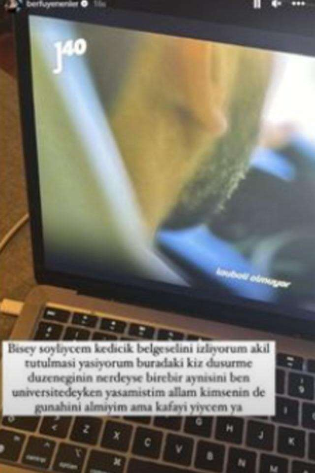 Sosyal medya hesabından paylaştığı videolar ile tanınan ünlü isim Eser Yenenler’in eşi olan Berfu Yenenler "Bir şey söyleyeceğim; Kedicik belgeselini izliyorum. Akıl tutulması yaşıyorum. Buradaki kız düşürme düzeneğinin neredeyse birebir aynısını ben üniversitedeyken yaşamıştım. Allah'ım kimsenin de günahını almayayım ama kafayı yiyeceğim ya" dedi.