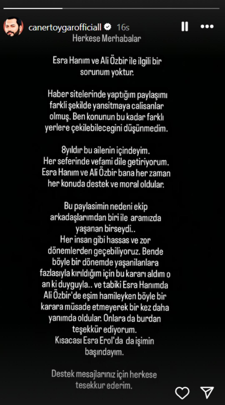 "Bu paylaşımın nedeni ekip arkadaşlarımdan biri ile aramızda yaşanan bir şeydi… Her insan gibi hassas ve zor dönemlerden geçebiliyoruz. Ben de böyle bir dönemde yaşananlara fazlasıyla kırıldığım için bu kararı aldım. O an ki duyguyla… Ve tabii ki Esra Hanım da Ali Özbir de eşim hamileyken böyle bir karara müsaade etmeyerek bir kez daha yanımda oldular. Onlara da buradan teşekkür ediyorum. Kısacası Esra Erol’da işimin başındayım.“