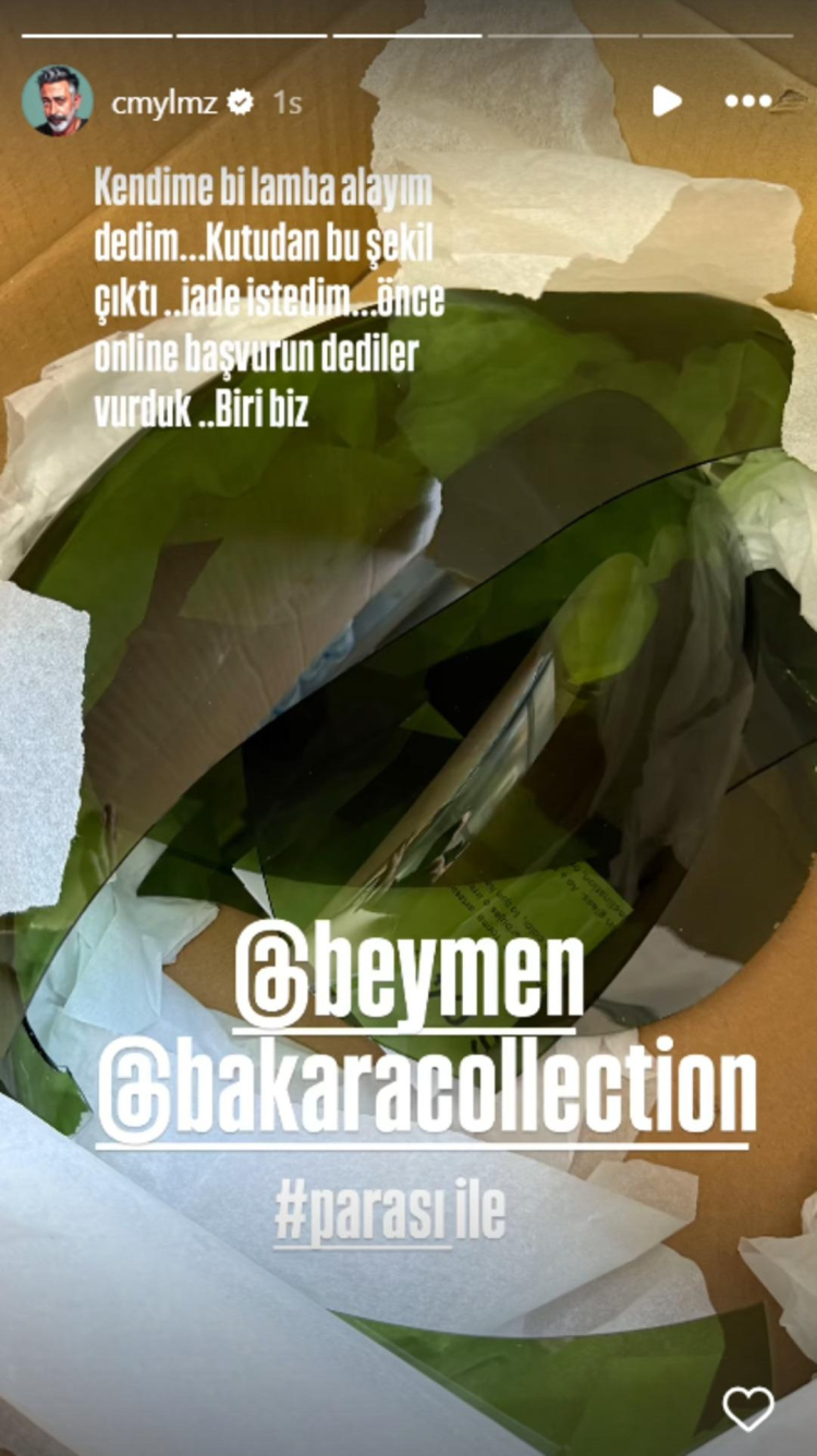 "Neredeyse 20 gün önce bu kırık lamba eve geldi. Fiziken geri gönderdim, rica ettim, yok dedi onlinedan kayıt oluşturun. Tamam dedik. @beymen'in uygulamasından kayıt oluşturdum arayan soran yok. Lamba 43 bin lira dedim 'Ya sabır…' @Bakaracollection'a mail attım, dediler yok biz kontrol edip kutuya koyuyoruz! Yani diyor ki; Cem efendi lambayı kırmışssın, bırak şimdi iade ayaklarını... Ben de huzurunuzda 43.000 TL'lik lamba için markasına 43 milyonluk zarar veren bu arkadaşları kutluyor başarılarının devamını diliyorum."