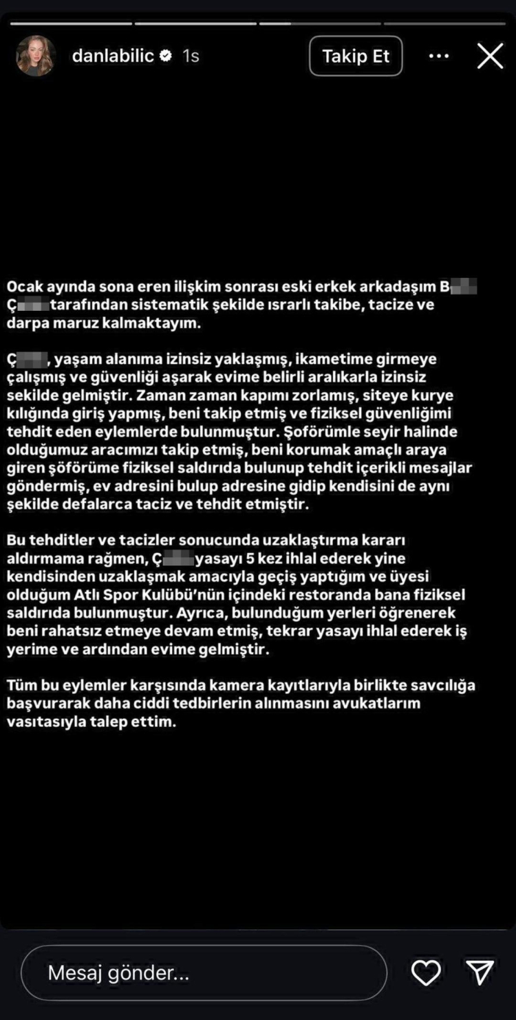 Bilic, "Ocak ayında sona eren ilişkim sonrası eski erkek arkadaşım B.Ç. tarafından sistematik şekilde ısrarlı takibe, tacize ve darpa maruz kalmaktayım. B.Ç., yaşam alanıma izinsiz yaklaşmış, ikametime girmeye çalışmış ve güvenliği aşarak evime belirli aralıklarla izinsiz şekilde gelmiştir. Zaman zaman kapımı zorlamış, siteye kurye kılığında giriş yapmış, beni takip etmiş ve fiziksel güvenliğimi tehdit eden eylemlerde bulunmuştur.