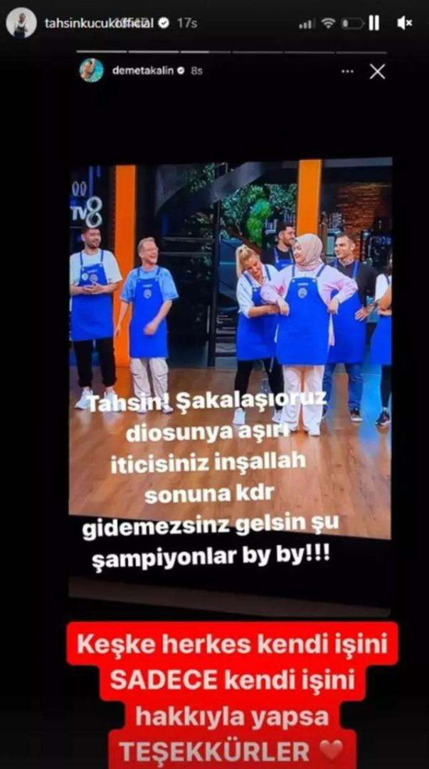 Tahsin Küçük'ün davranışlarından rahatsız olan Demet Akalın, Instagram hesabında yaptığı paylaşımda "Tahsin, 'şakalaşıyoruz' diyorsun ya aşırı iticisiniz. İnşallah sonuna kadar gidemezsiniz. Gelsin şu şampiyonlar bay" dedi.
