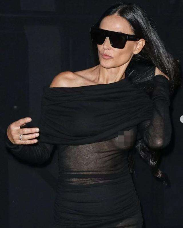 60 yaşındaki yıllara meydan okuyan oyuncu şeffaf siyah bir elbiseyle göz alıcı görünüyordu. Demi poz verirken kolunu yukarı kaldırdı ve yanlışlıkla göğsünü gösterdi.