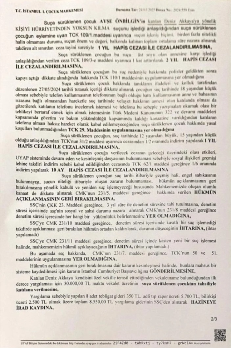 Deniz Akkaya'nın 16 yaşındaki kızı Ayşe Önbilgin, 'annesine şiddet uyguladığı ve özgürlüğünü kısıtladığı' gerekçesiyle 2 yıl hapis cezası alırken, yaşının küçük olması nedeniyle ceza 10 aya indirildi. Akkaya, kızının hapis kararını sosyal medyadan hakim ve savcılara teşekkür ederek kutladı.