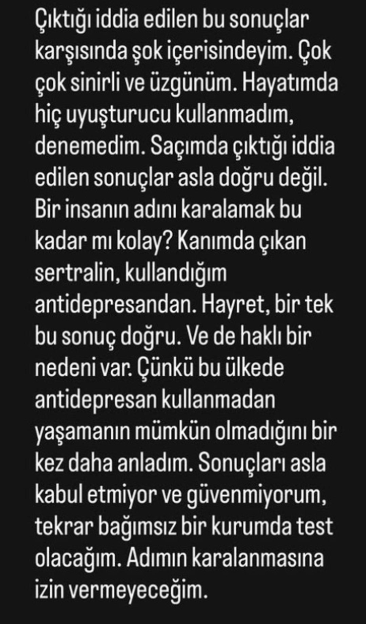 Bu ülkede antidepresan kullanmadan yaşamanın mümkün olmadığını bir kez daha anladım. Sonuçları asla kabul etmiyorum. Tekrar bağımsız bir kurumda test olacağım. Adımın karalanmasına izin vermeyeceğim."