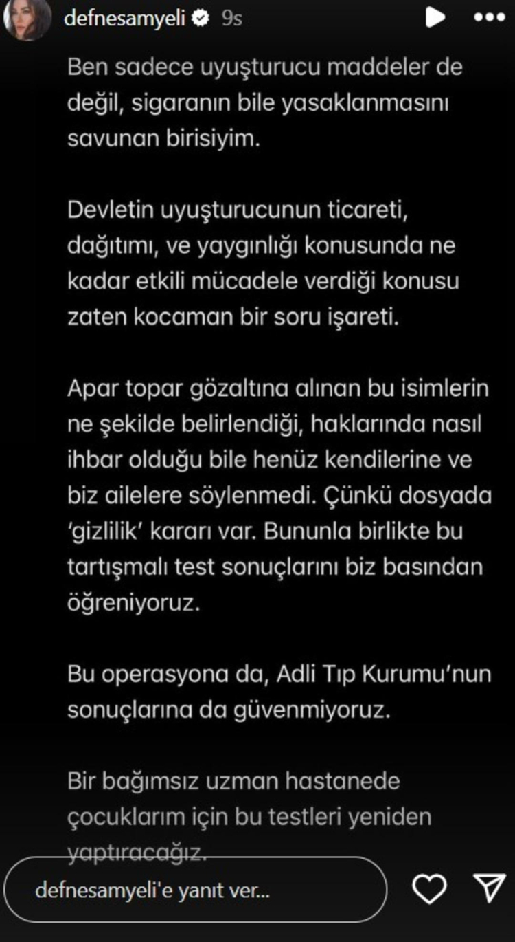 Uyuşturucu operasyonu kapsamında kan ve saç örneği alınan Defne Samyeli'nin kızları Derin ve Deren'in test sonuçlarının pozitif çıktığı öğrenildi. Sonuçların ortaya çıkmasından sonra Deren Talu, "Tekrar bağımsız bir kurumda test olacağım" derken annesi Samyeli, "Adli Tıp Kurumu'nun sonuçlarına da güvenmiyoruz" diyerek sert açıklamalarda bulundu.