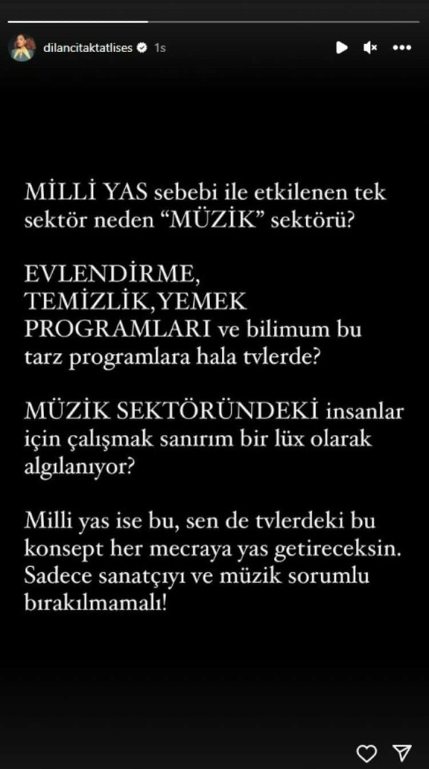 Dilan Çıtak paylaşımında "Milli yas sebebiyle etkilenen tek sektör neden müzik sektörü. Evlendirme, temizlik, yemek programları ve bilimum bu tarz programlar hâlâ TV'de... Müzik sektöründeki insanlar için çalışmak sanırım bir lüx olarak algılanıyor?