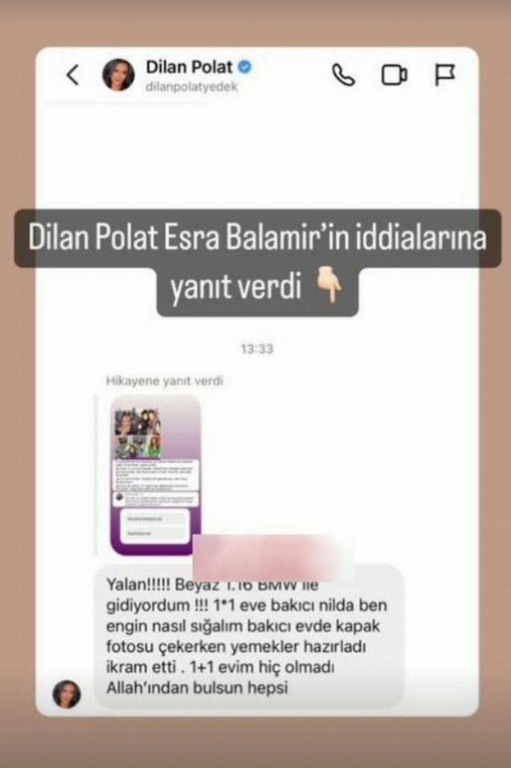 Dilan Polat ise günler sonra sessizliğini bozarak isyan etti. Dilan Polat "Evine de gittim. 1+1 apartman dairesinde oturuyordu. Sonradan zenginliğini görünce inanamadım" diyen Esra Balamir'e şu sözlerle tepki gösterdi: