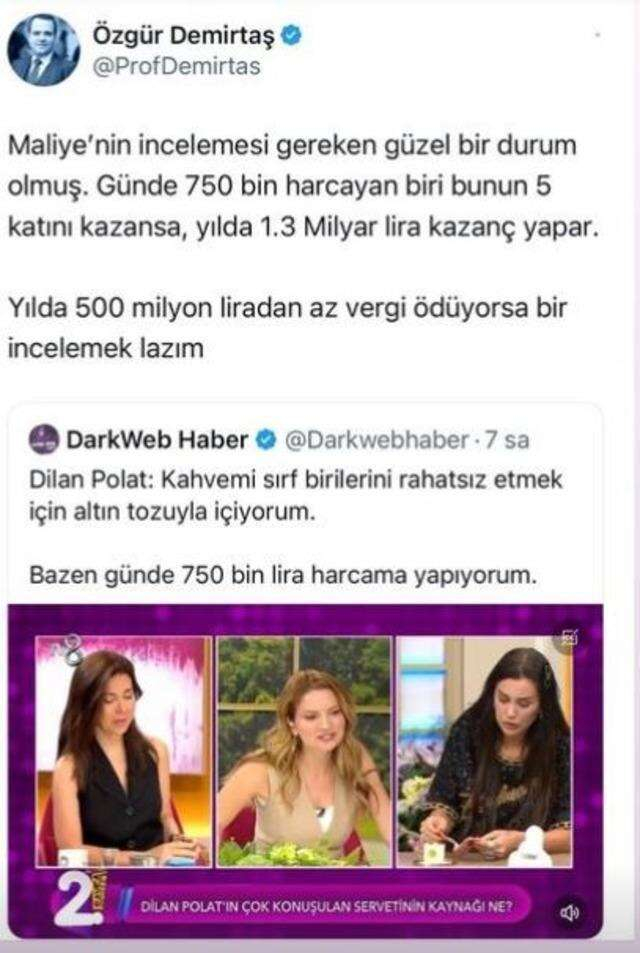 Prof. Dr. Özgür Demirtaş, Dilan Polat’ın açıklamalarına ilişkin “Maliye’nin incelemesi gereken güzel bir durum olmuş. Günde 750 bin harcayan biri bunun 5 katını kazansa, yılda 1.3 milyar lira kazanç yapar. Yılda 500 milyon liradan az vergi ödüyorsa bir incelemek lazım. "dedi.